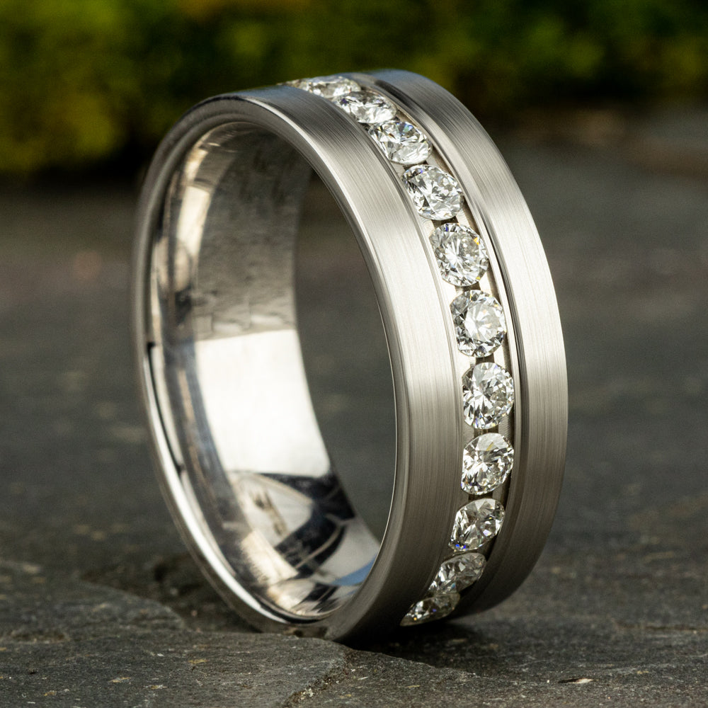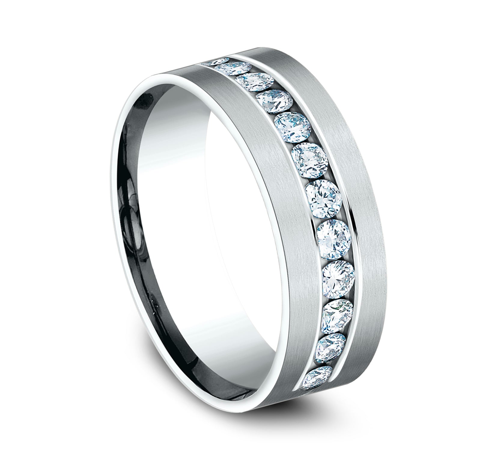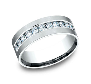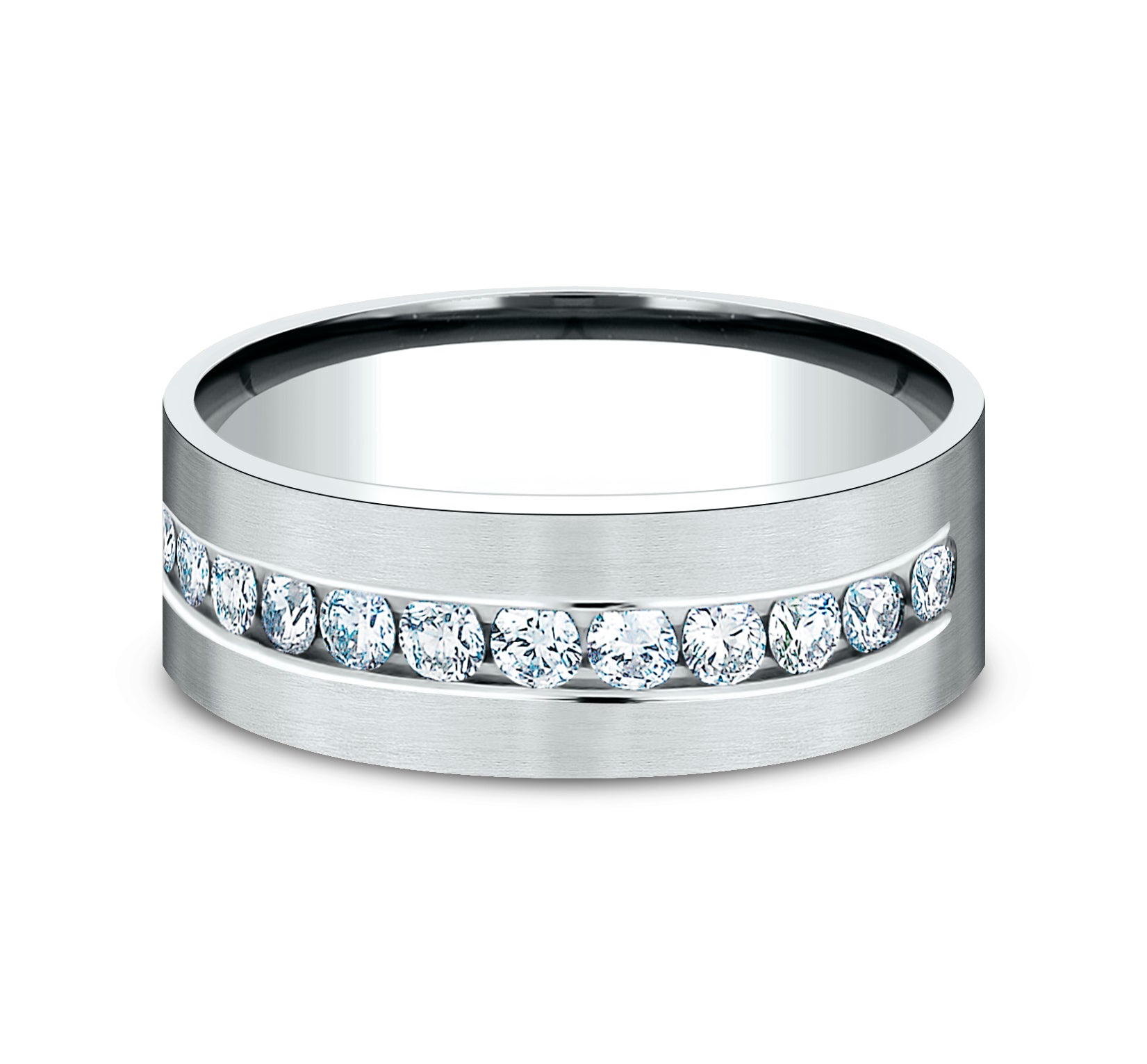 8mm, Comfort fit 14K White Gold Satin finish 12 channel set diamonds Carat weight is .96ct Clarity SI1-2, Color GH