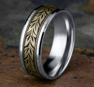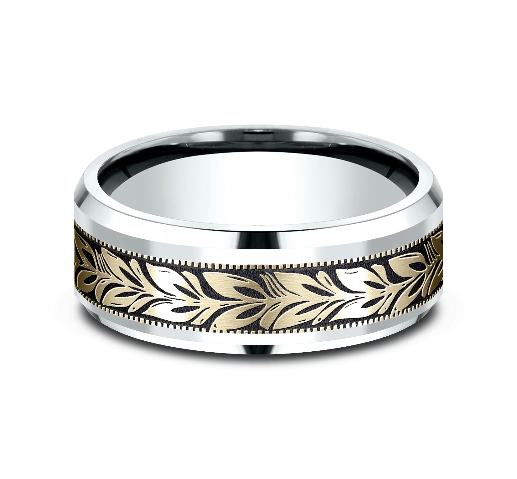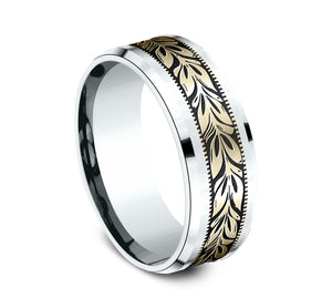 8mm, Comfort fit 14K White and Yellow Gold Leaf motif with wear resistant black detailing, polished bevel edges