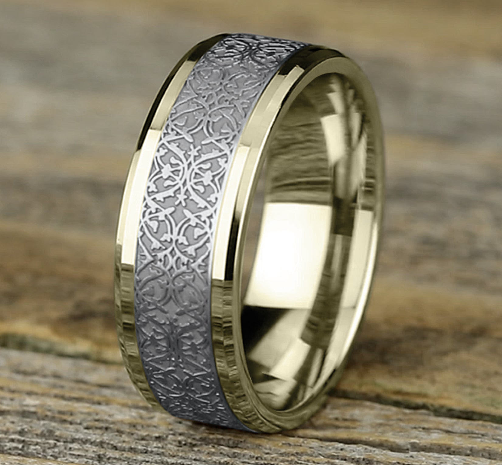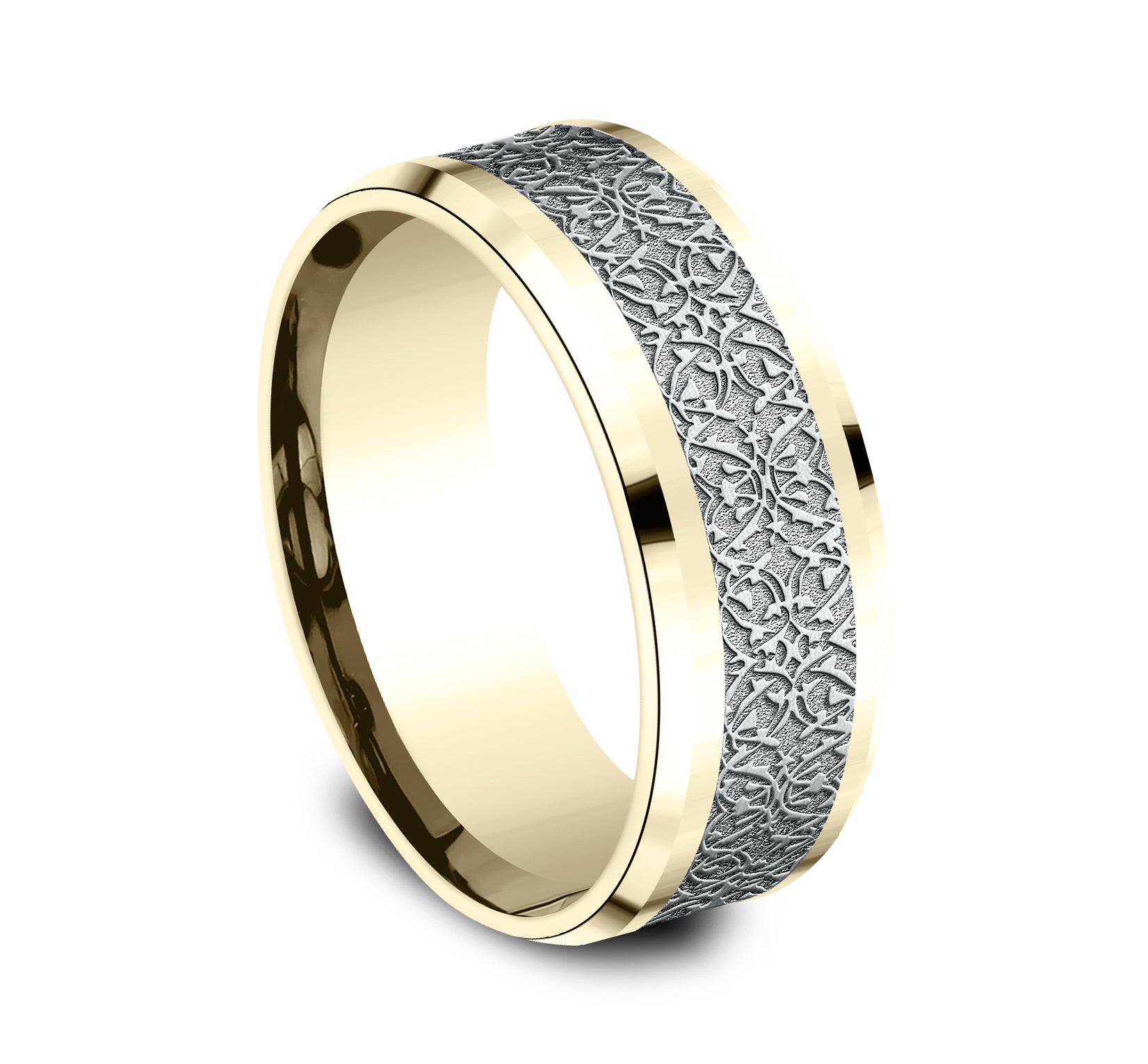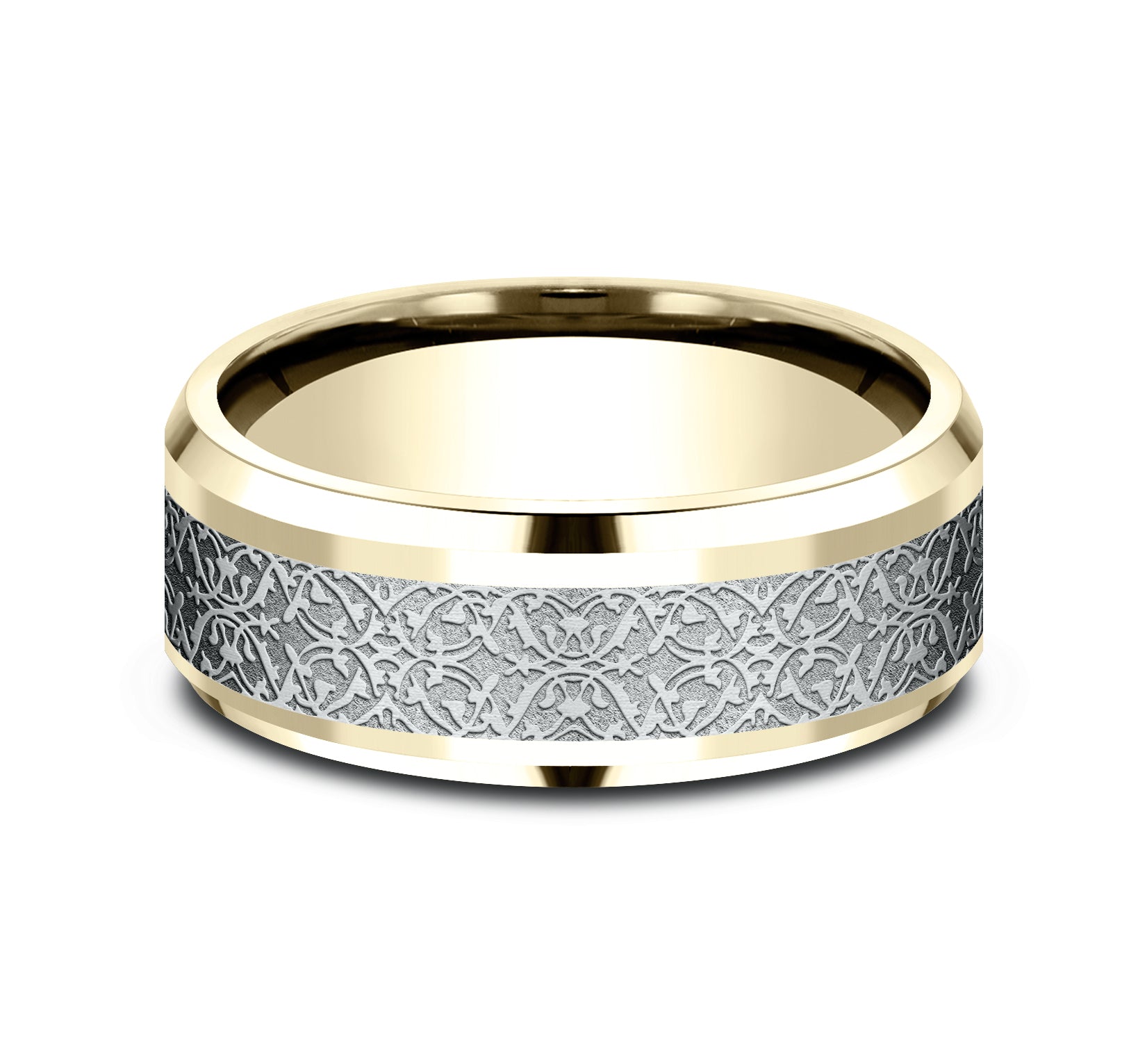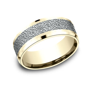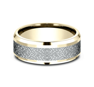 8mm, Comfort fit 14K Yellow and White Gold Ottoman pattern, polished drop bevel edges