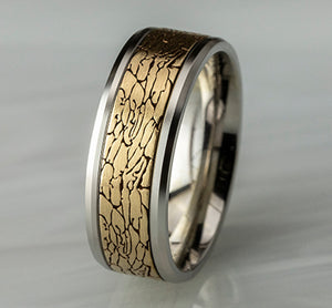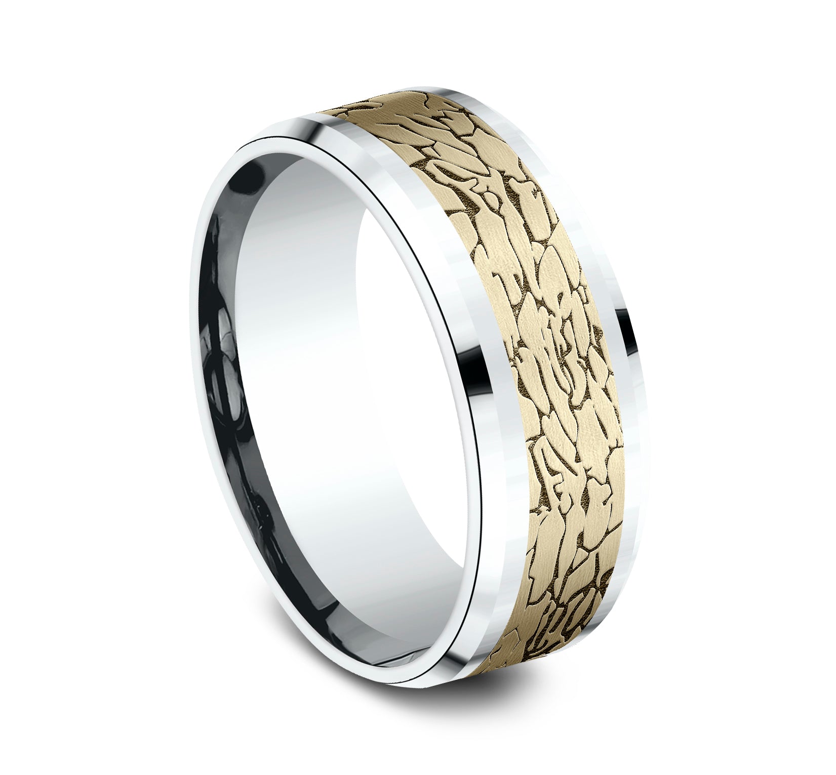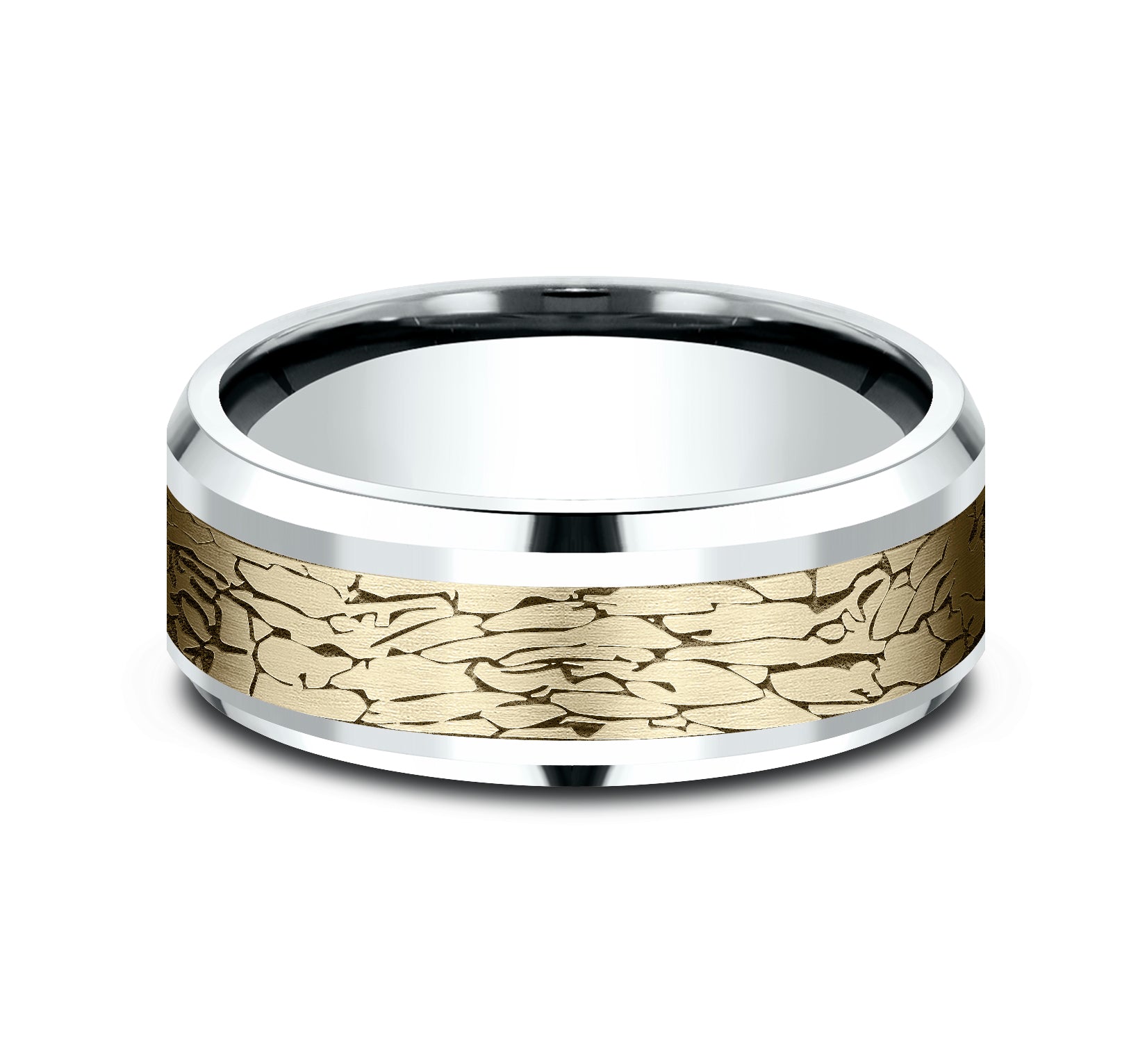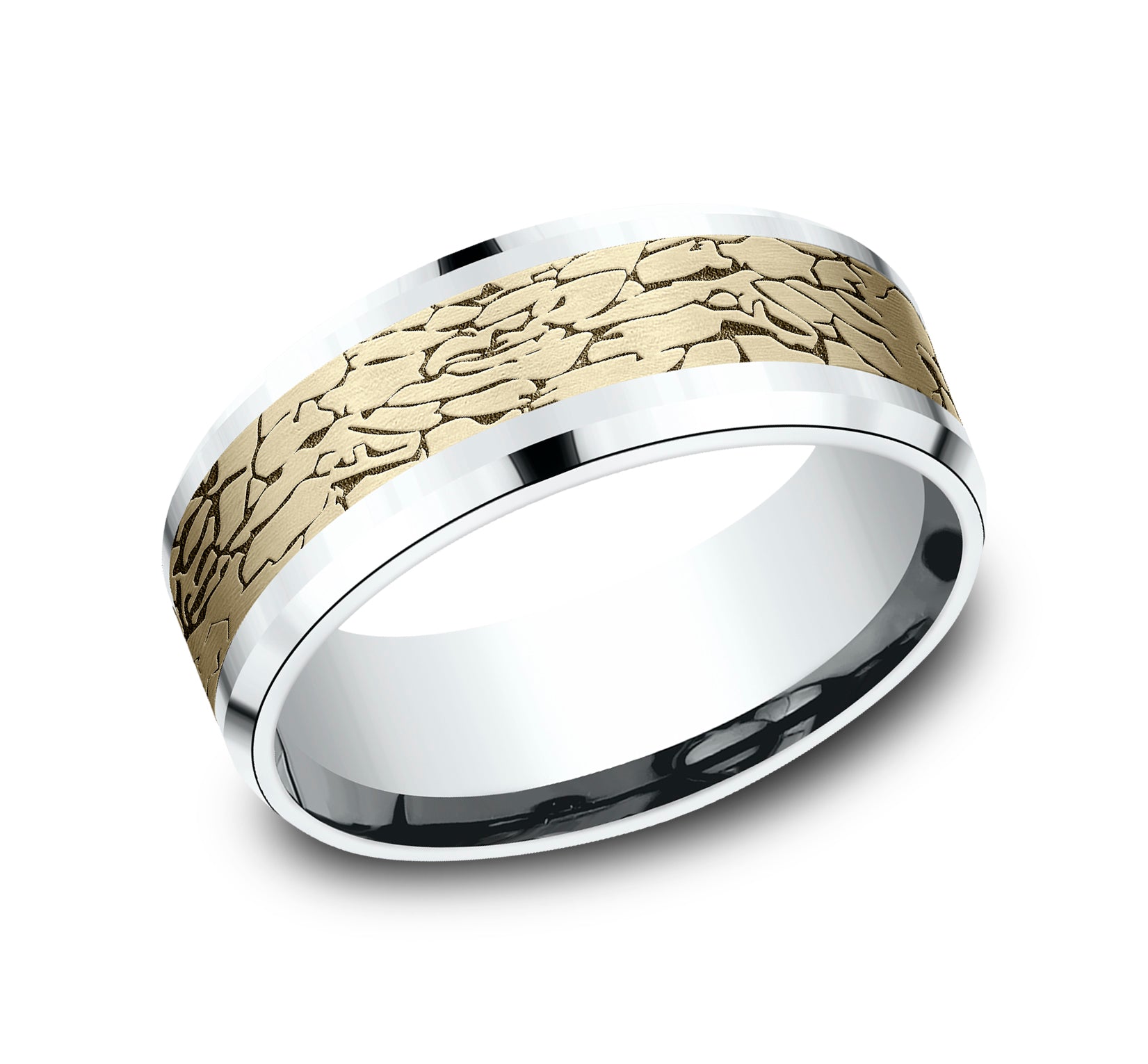 8mm, Comfort fit 14K White and Yellow Gold Fractured rock pattern, polished bevel edges