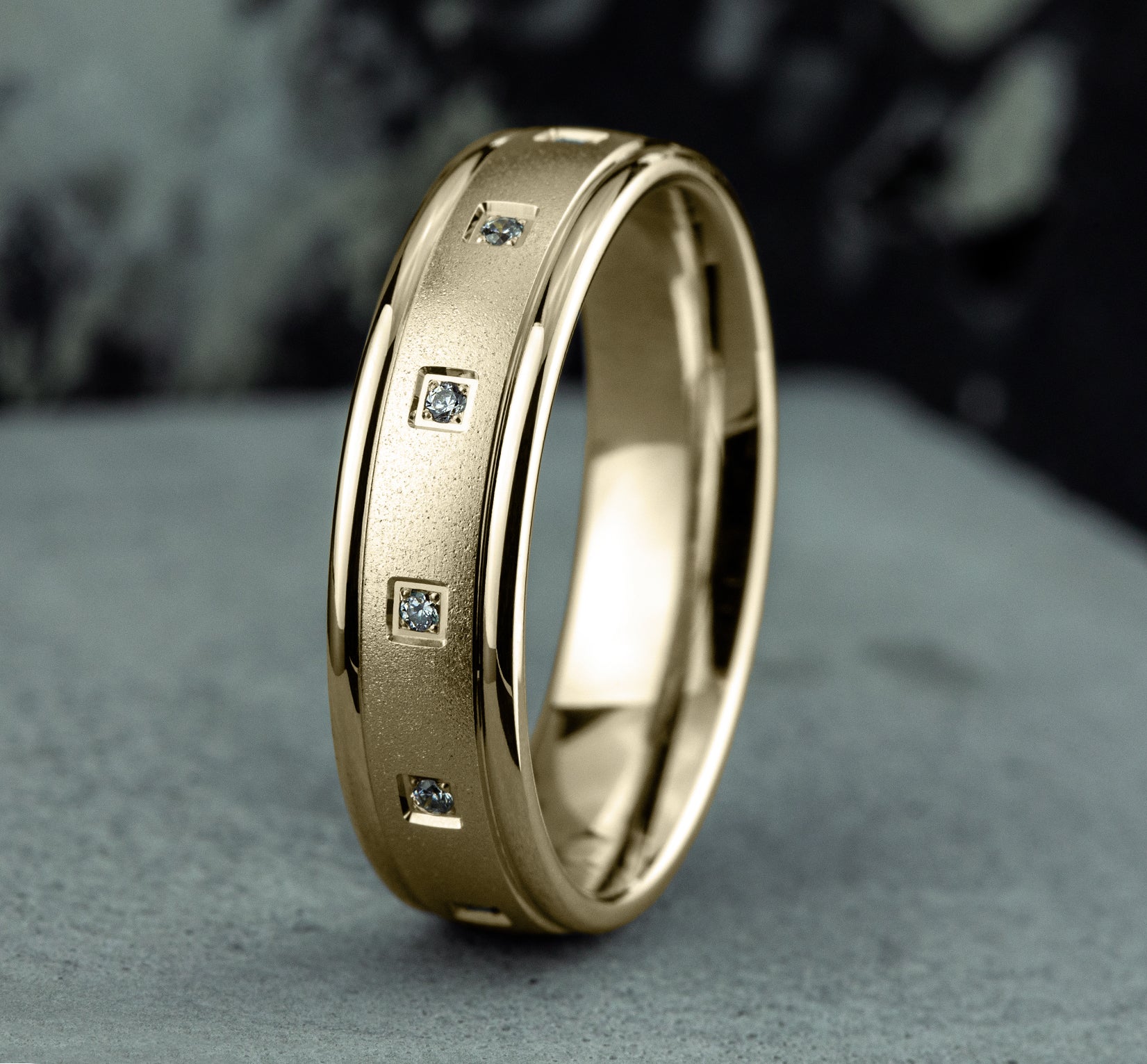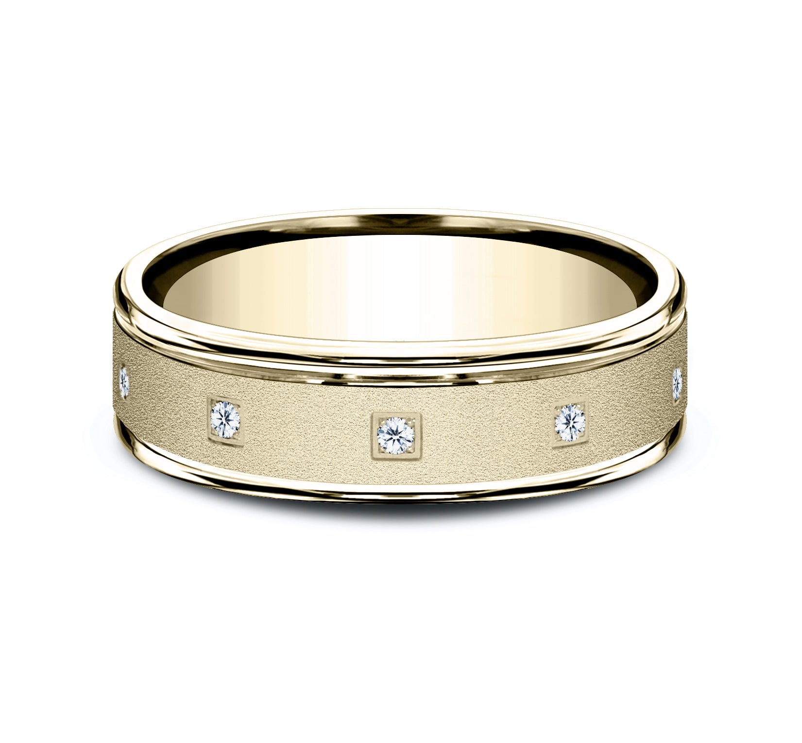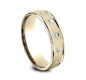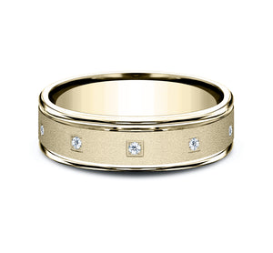 6mm, Comfort fit 14K Yellow Gold Satin center, polished round edges 12 pave set diamonds Carat weight is .12ct Clarity SI1-2, Color GH