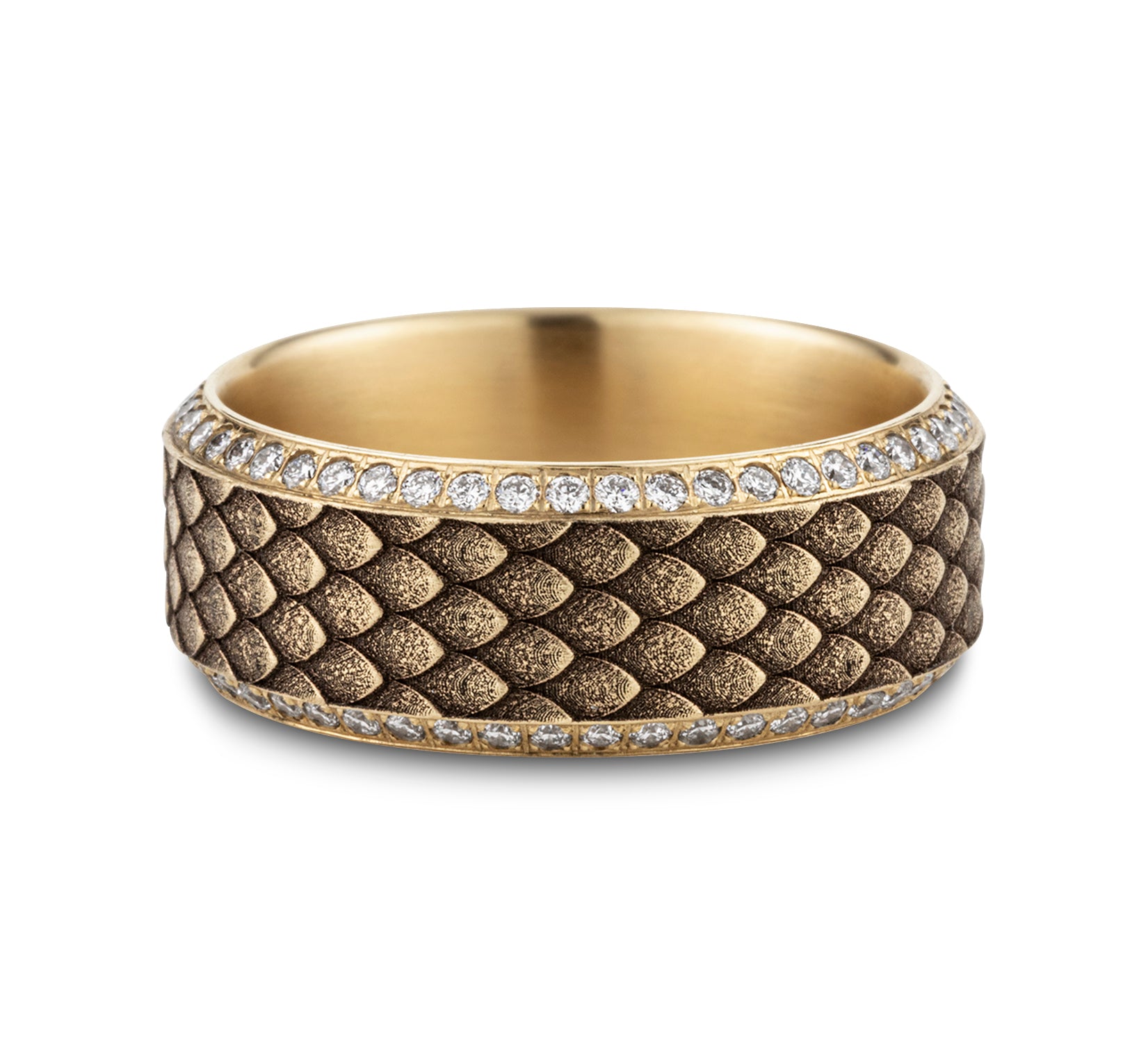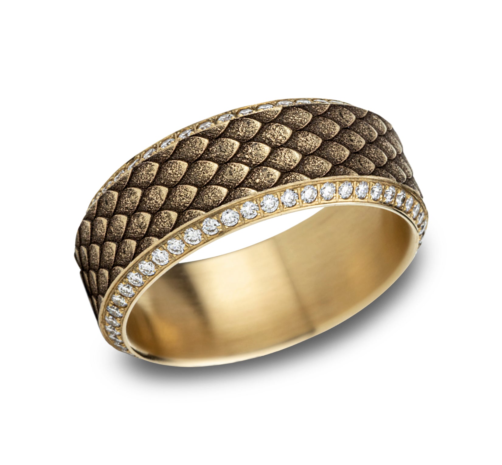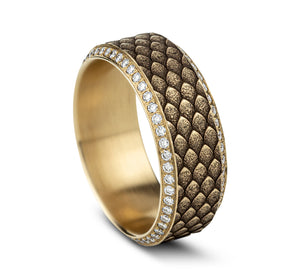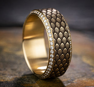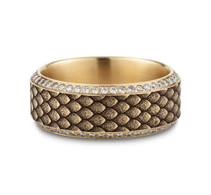 9mm, Comfort fit 14K Yellow Gold Dragon scale patterned center with double eternity diamond edges 100 pave set diamonds Carat weight is 1.00ct Clarity SI1-2, Color GH