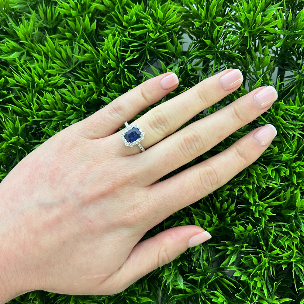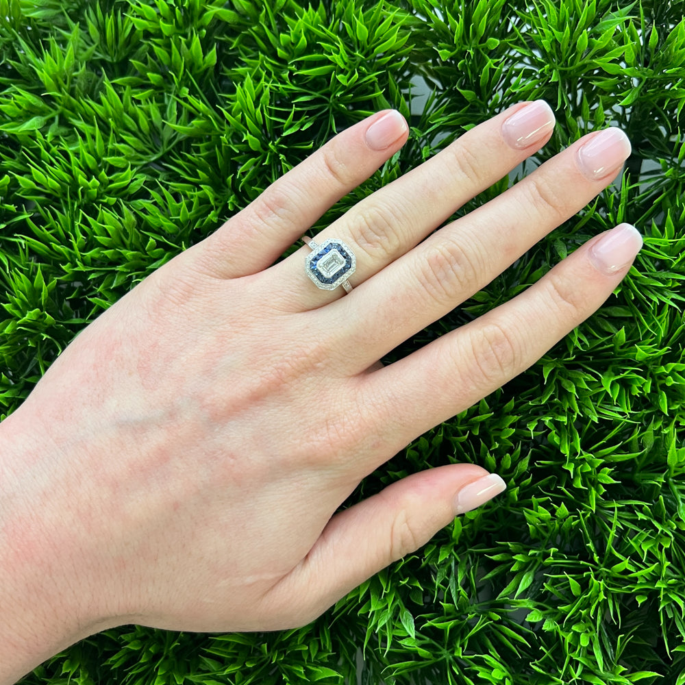 DFJ 14 Karat White Gold Emerald Cut Sapphire & Diamond Halo Ring