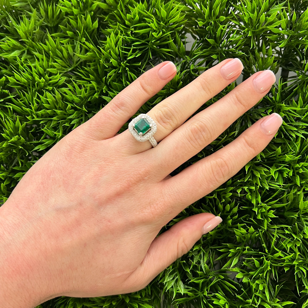 DFJ 18 Karat White Gold Emerald Cut Emerald & Diamond Halo Ring