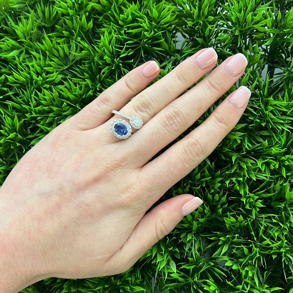 DFJ 18 Karat White Gold Two Stone Sapphire & Diamond Halo Ring