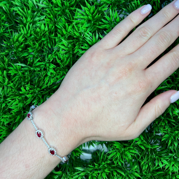 DFJ 14 Karat White Gold Ruby & Diamond Halo Bracelet