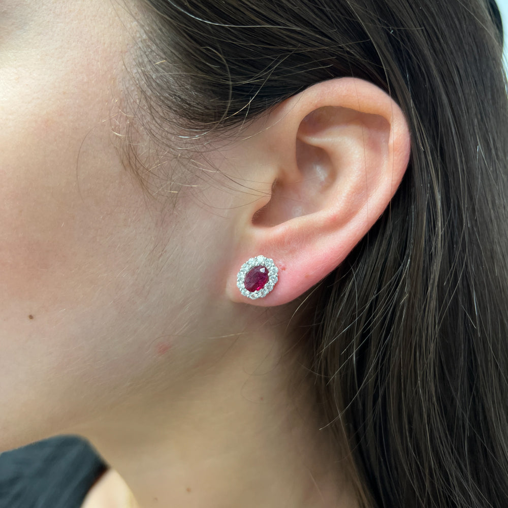 DFJ 18 Karat White Gold Oval Cut Rubies Stud Halo Earrings - 1.75 TWT