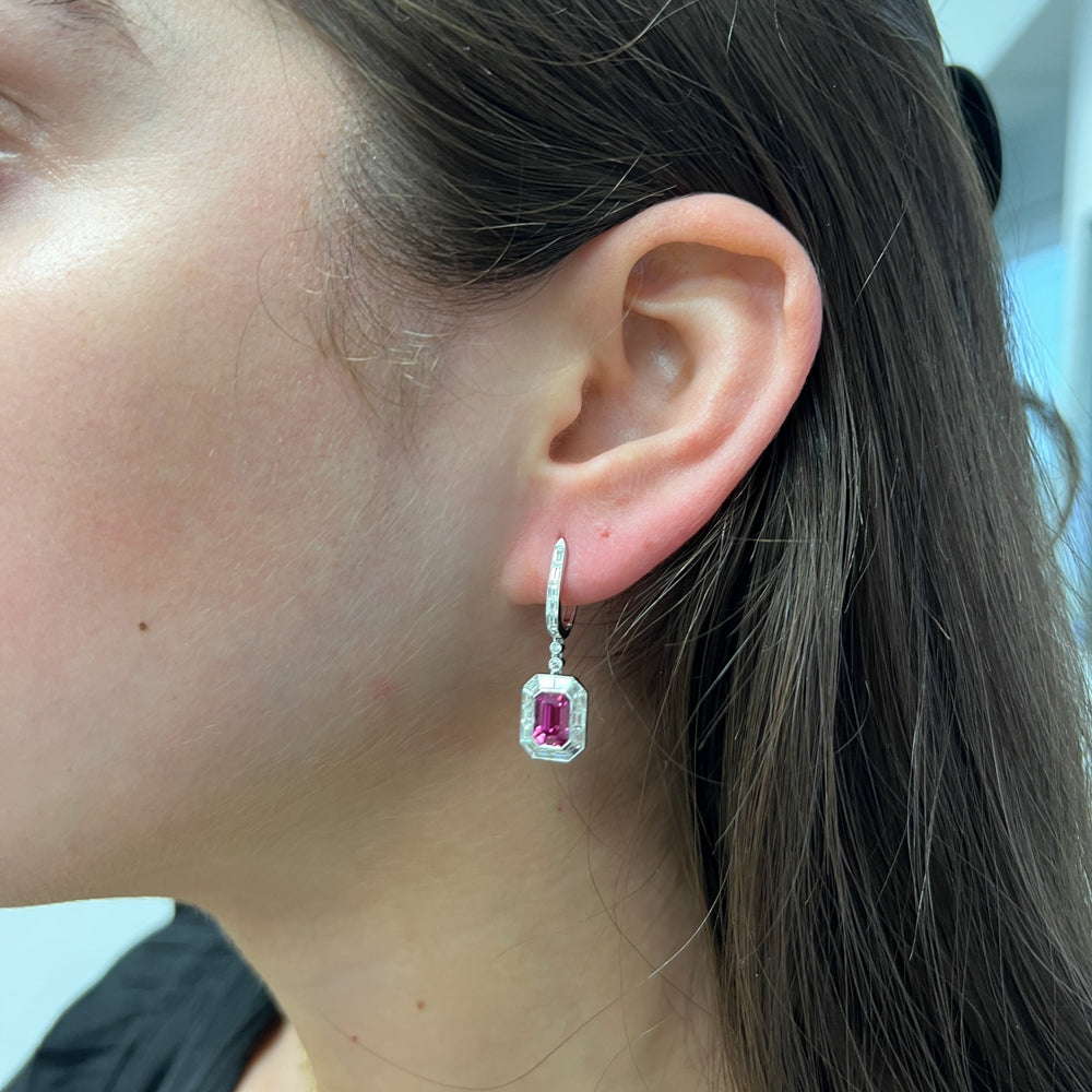 DFJ 18 Karat White Gold Emerald Cut Ruby & Diamond Earrings - 3.10 TWT