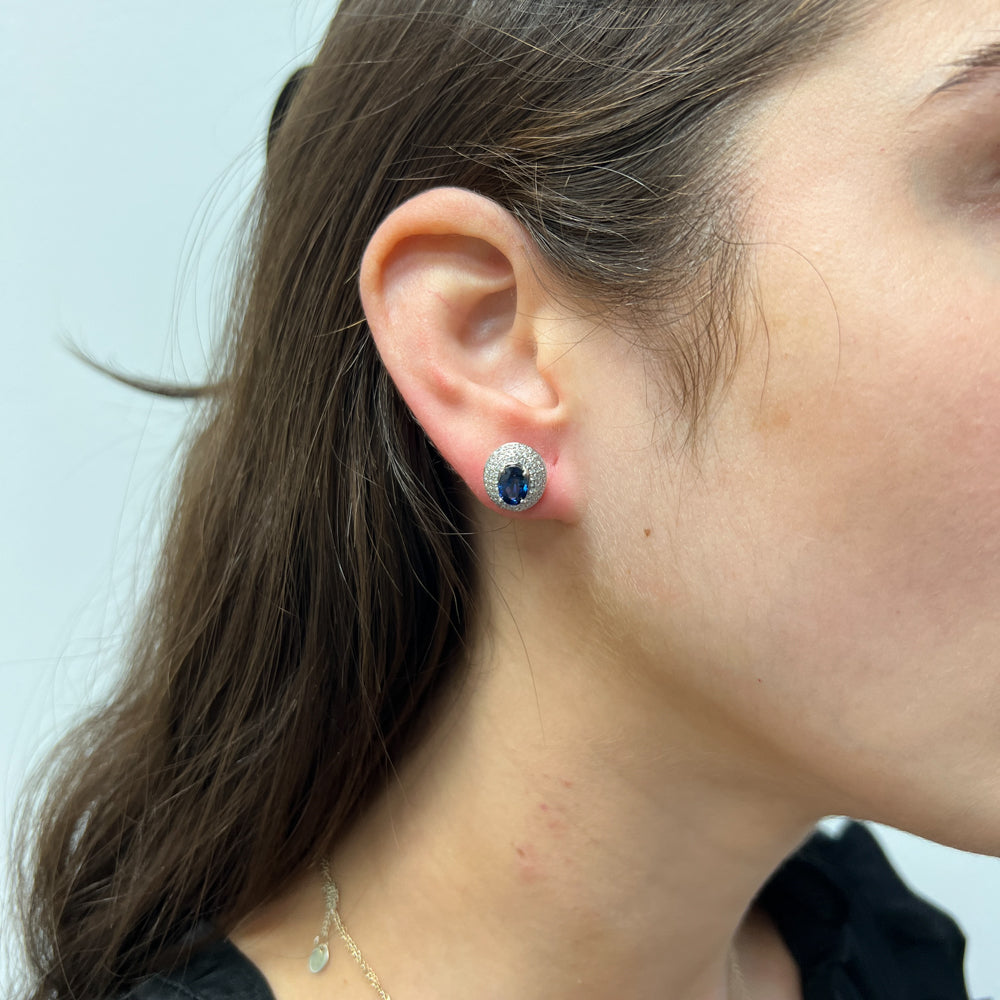 DFJ 18 Karat White Gold Oval Cut Sapphire & Pave Halo Earrings - 1.09 TWT