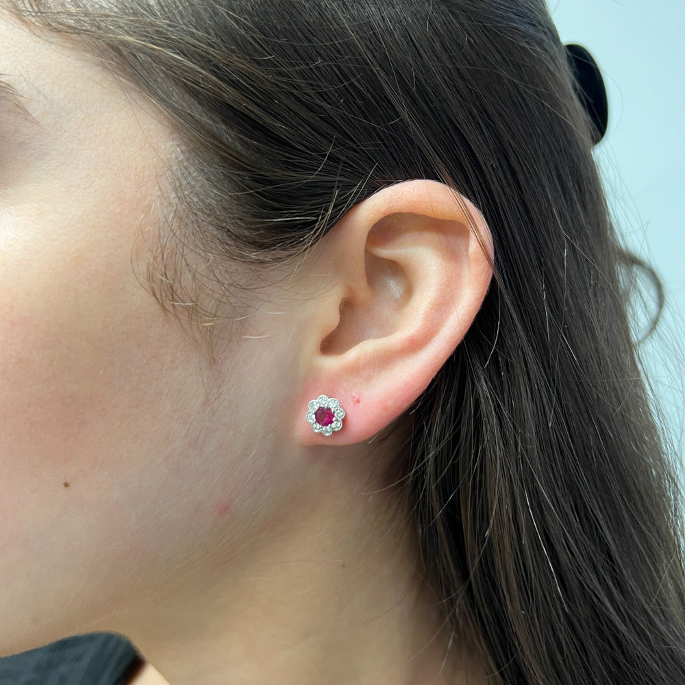 DFJ 14 Karat White Gold Round Ruby Floral Earrings - 0.60 TWT