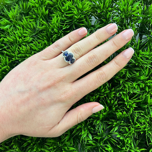 DFJ 18 Karat White Gold Two Stone Sapphire & Diamond Halo Ring