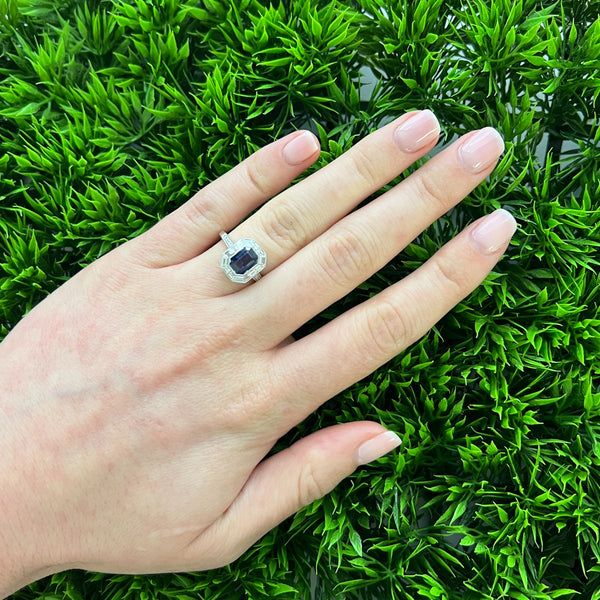 DFJ 14 Karat White Gold Emerald Cut Sapphire & Diamond Halo Ring