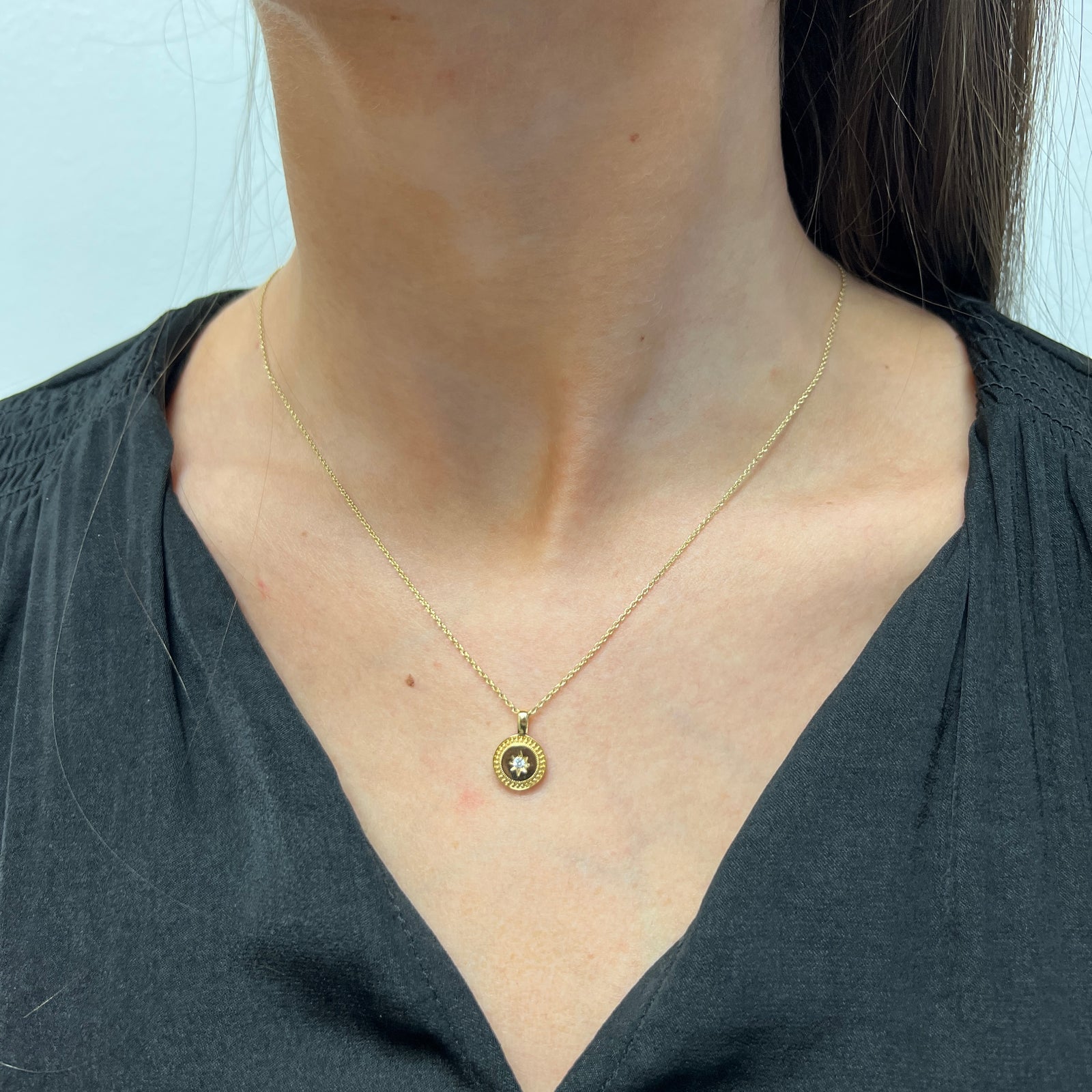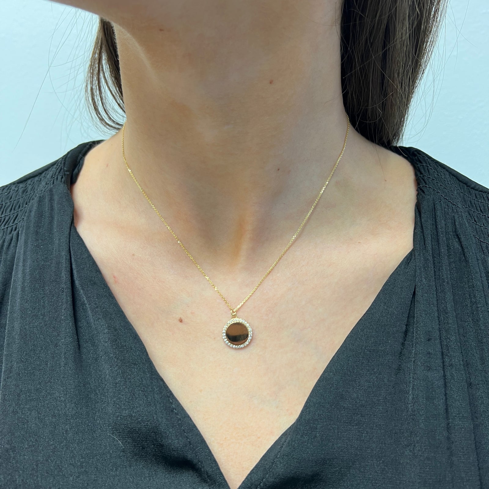 DFJ 14 Karat Yellow Gold Diamond Border Disc Necklace