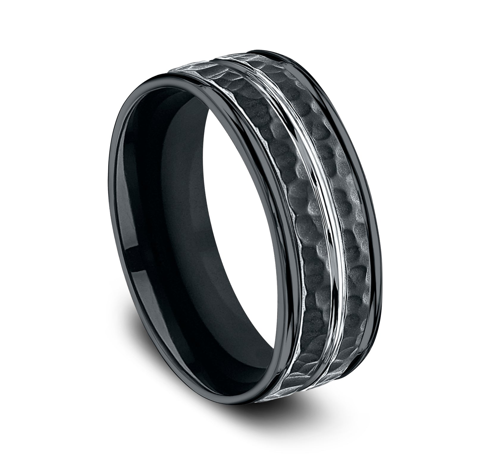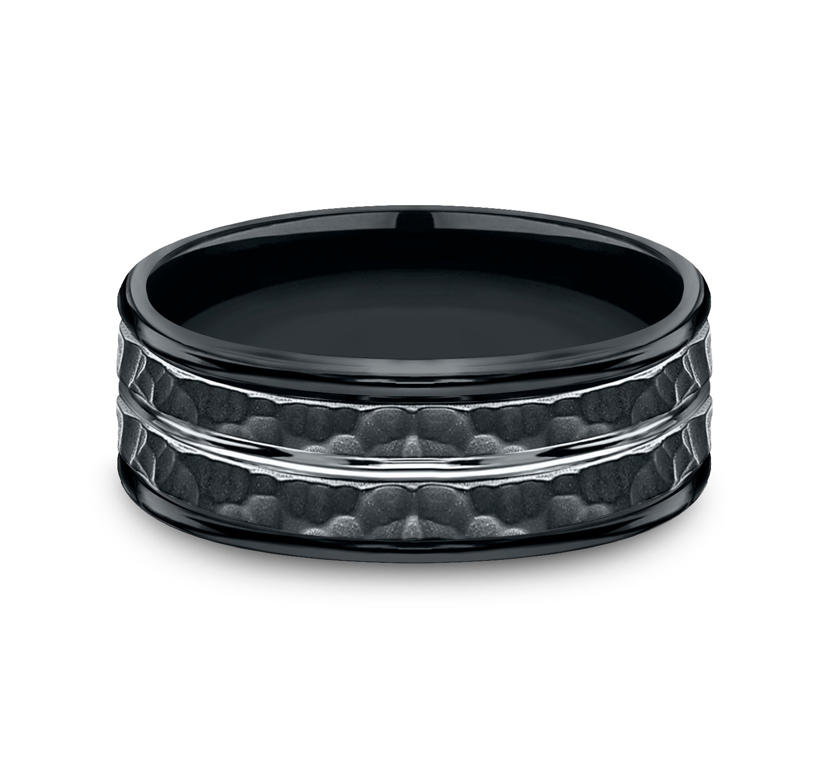 8mm, Comfort fit Black Cobalt Hammered finish and polished center cut, round edges